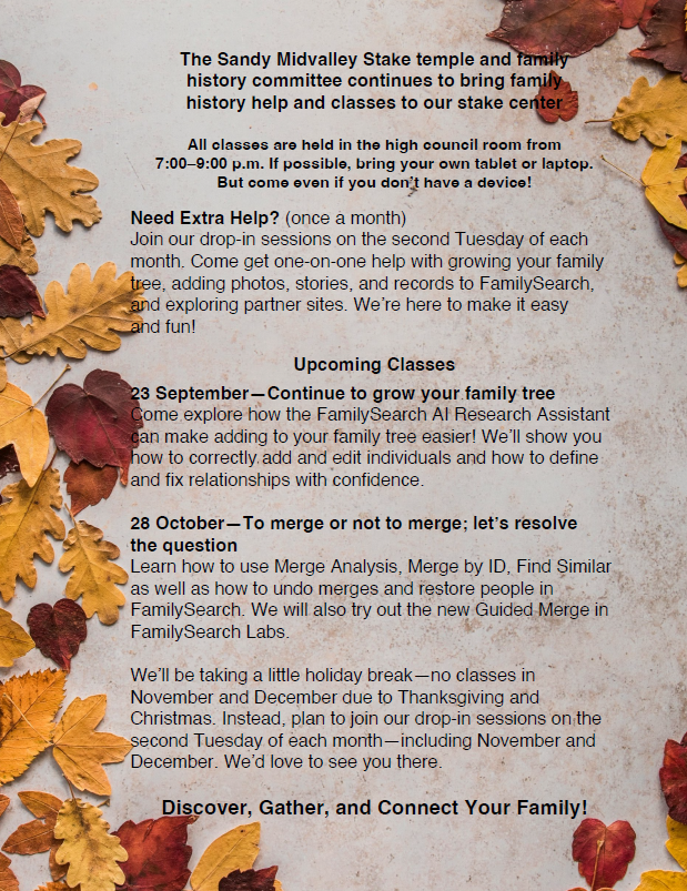 Midvale Utah Union Fort FamilySearch Center Class Schedule